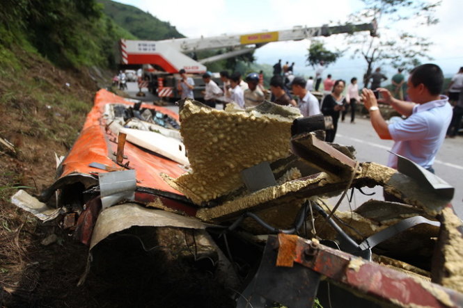 | Sau vụ tai nạn, phần nóc xe của xe Sao Việt đã bị bung khỏi thân xe, do nằm tại vị trí thuận lợi nên việc di chuyển bộ phần này khá dễ dàng - Ảnh: Nguyễn Khánh |