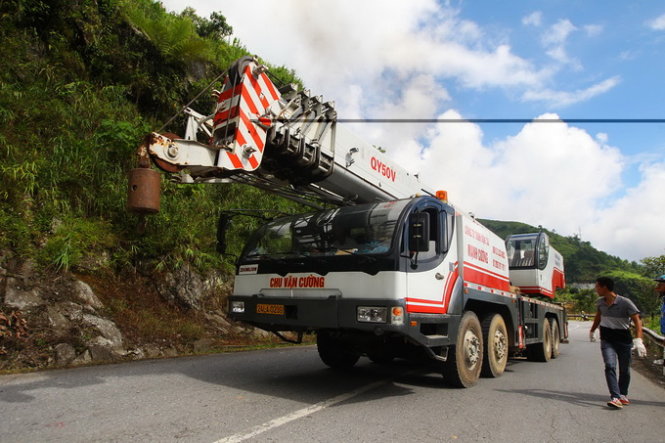 Chiếc xe kéo trọng tải 50 tấn của công ty TNHH vận tải Mạnh Cường đã có mặt tại khu vực chiếc xe khách hãng Sao Việt gặp nạn tại km 122+800 quốc lộ 4D, huyện Sapa, tỉnh Lào Cai.