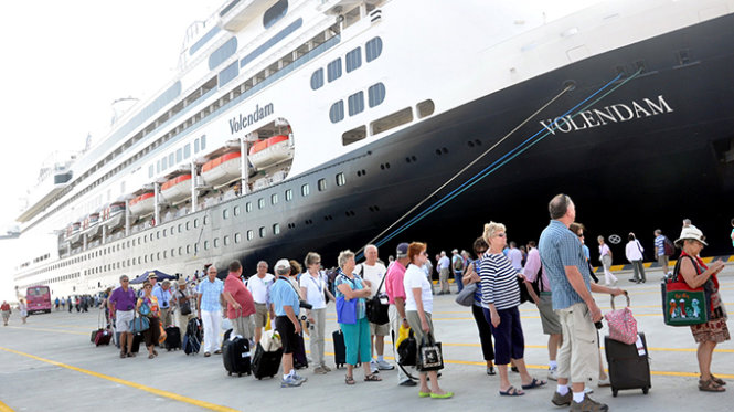 | Ngày 23-2 (mùng 5 tết), tàu Volendam (quốc tịch Hà Lan) đã cập cảng ở Tân Thành (Bà Rịa - Vũng Tàu) mang theo gần 1.300 khách quốc tế. Năm 2015, ngành du lịch Việt Nam phấn đấu đón khoảng 8,5 triệu lượt khách quốc tế - Ảnh: Đông Hà |