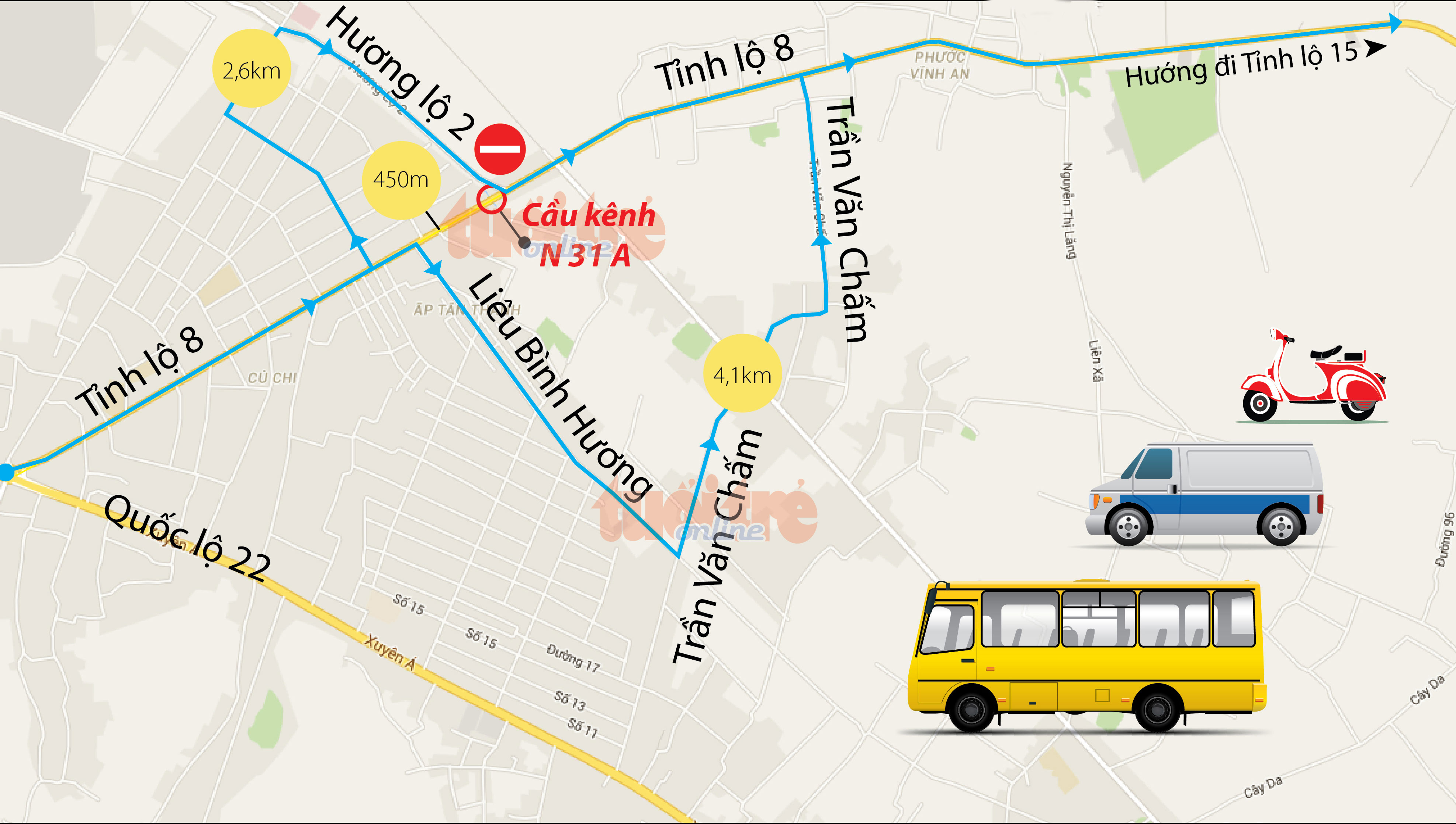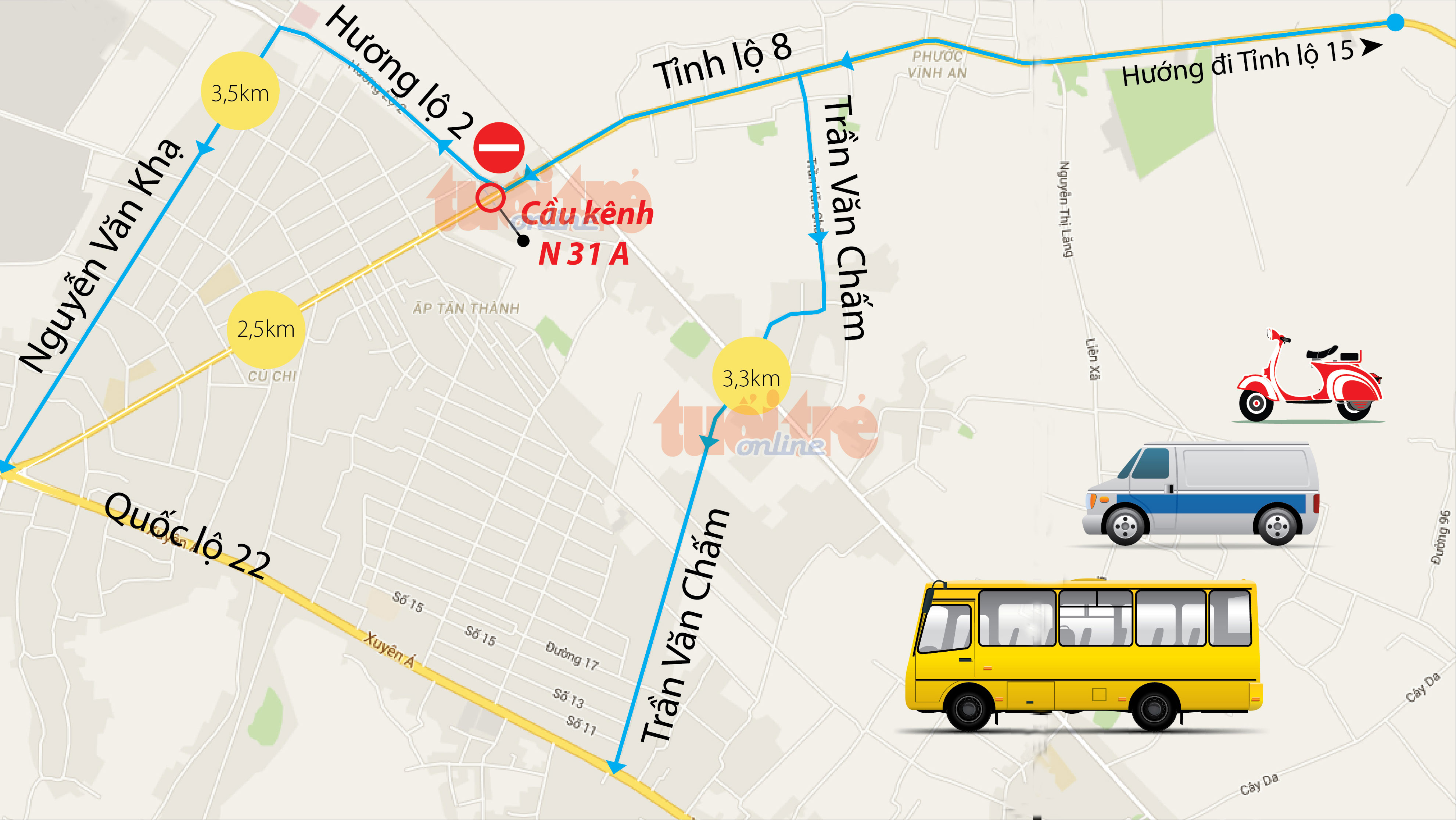 * Kể từ 6 giờ ngày 26-9-2015 đến 21-5-2016 cấm tất cả xe lưu thông qua cầu kênh N 31 A trên Tỉnh lộ 8, huyện Củ Chi, do thi công xây dựng cầu Kênh N 31 A mới.