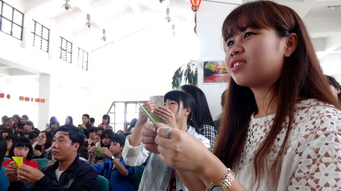 Các sinh viên đang tham gia trò chơi xếp giấy truyền thống của Nhật Bản - Ảnh: LÂM THIÊN |