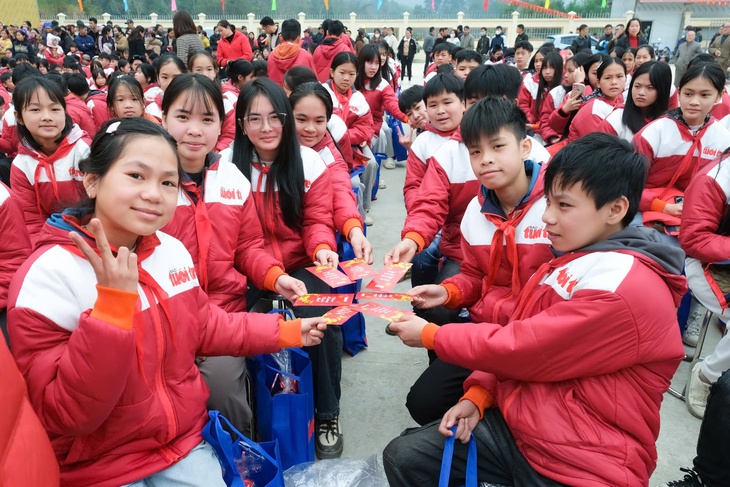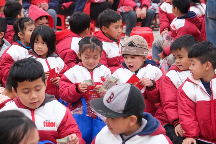 Niềm vui của học sinh tại khu vực xã Hoa Thám (Lạng Sơn) khi nhận được lì xì, quà từ chương trình "Tết sẻ chia" - Ảnh: HÀ QUÂN