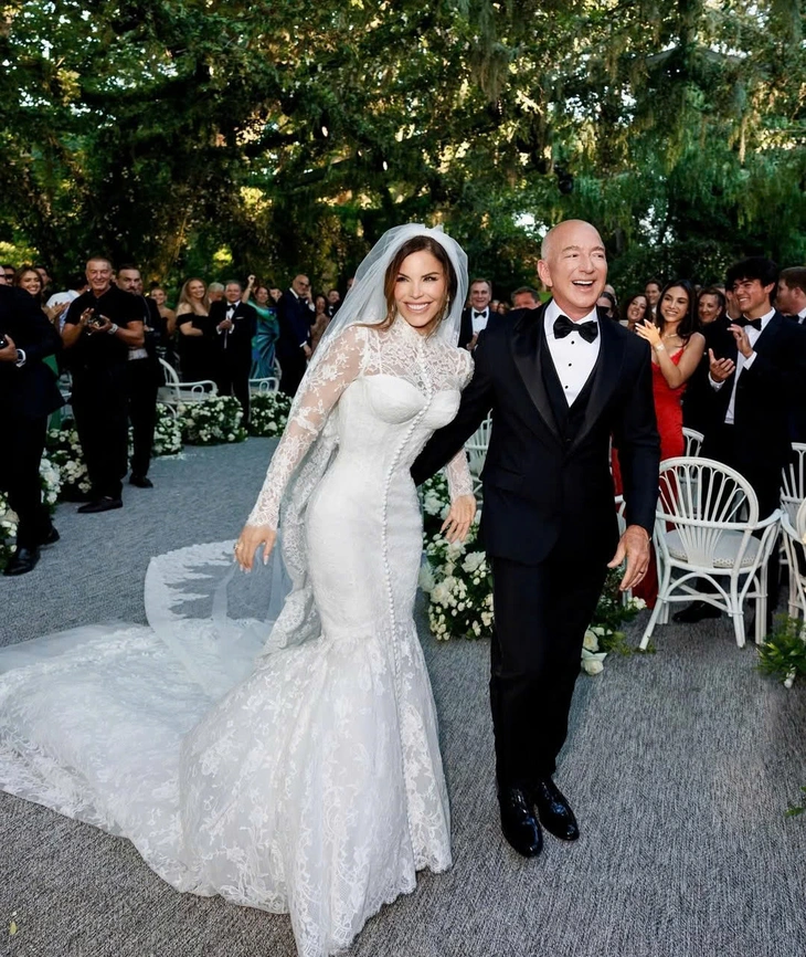 Khoảnh khắc tỉ phú Jeff Bezos và nữ nhà báo Lauren Sánchez nên duyên vợ chồng hồi tháng 6-2025. Váy cưới được đặt may riêng bởi nhà mốt Dolce & Gabbana với thiết kế ôm dáng kiểu đuôi cá, điểm xuyết ren Ý thủ công cùng đôi bông tai từ chính thương hiệu - Ảnh: IGNV