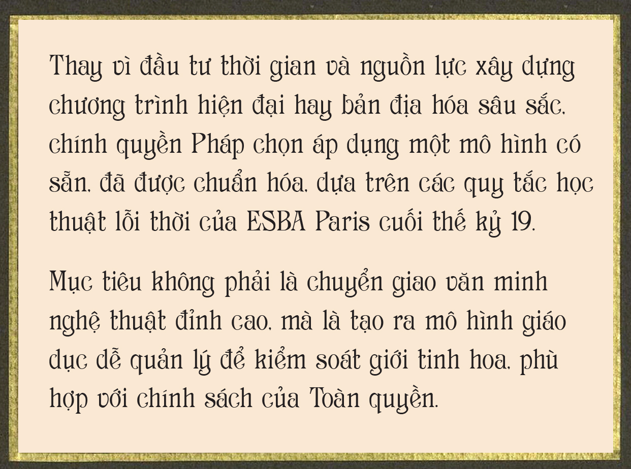 Nhưng do EBAI là một cơ sở đào tạo tay nghề và sản xuất nghệ thuật thị giác, di sản của nó mang tính hữu hình, dễ dàng được bản địa hóa: khi Tô Ngọc Vân tiếp quản trường, người Việt kế thừa một thể chế liên tục và tài sản vật chất có thể tái sử dụng ngay lập tức cho mục tiêu dân tộc (Trường Mỹ thuật Việt Nam).