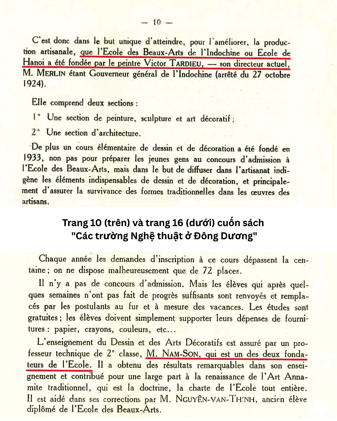 Sự mâu thuẫn thông tin trong cùng cuốn sách Các trường Nghệ thuật ở Đông Dương. Trang 10: "Trường Mỹ thuật Đông Dương, hay Trường Hà Nội, được sáng lập bởi họa sĩ Victor Tardieu, là Hiệu trưởng đương nhiệm" Trang 16: "Ông Nam Sơn là một trong hai người sáng lập Trường".