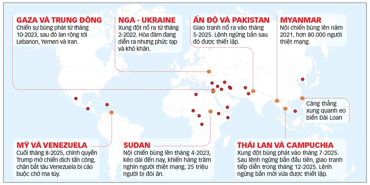 Các cuộc xung đột đang diễn ra được hiển thị bằng những chấm tròn trên Công cụ theo dõi xung đột toàn cầu của Hội đồng Quan hệ đối ngoại - một tổ chức nghiên cứu độc lập, phi đảng phái của Mỹ - Nguồn: Cfr.org - Đồ họa: Tuấn Anh - Dữ liệu: Hải Minh
