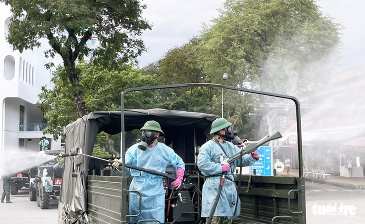Lực lượng làm nhiệm vụ phun khử khuẩn bệnh viện - Ảnh: THÀNH HUY