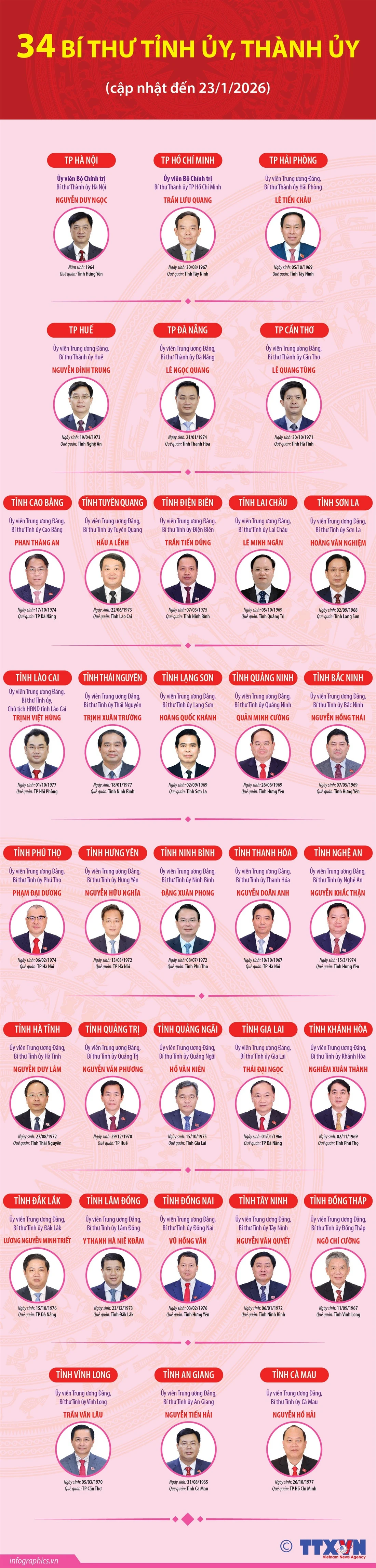 Tuổi Trẻ Online trân trọng giới thiệu danh sách 34 Bí thư Tỉnh ủy, Thành ủy, cập nhật đến ngày 23-1-2026.
