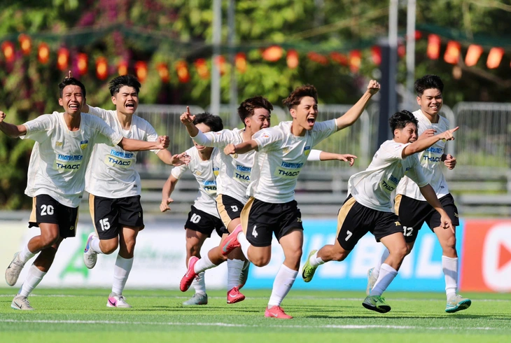 Màn ăn mừng của các cầu thủ tham dự Giải bóng đá sinh viên thanh niên Việt Nam tổ chức tại Nha Trang - Ảnh: BÁ DUY