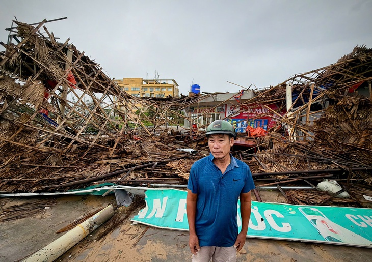Ông Đặng Thế Quân ở xã Thiên Cầm (Hà Tĩnh) đau xót khi nhà hàng của gia đình bị bão quật đổ sập - Ảnh: NGUYỄN KHÁNH
