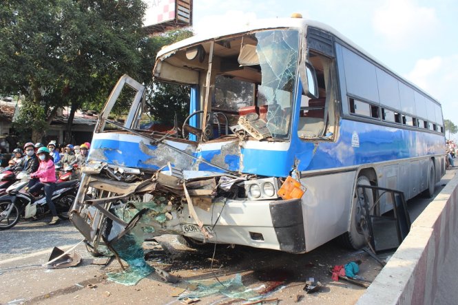 Vừa qua khỏi ngã ba 621 khoảng 100m (khu phố Giãn Dân, P.Long Bình, Q.9, TP.HCM) do các xe đi trước thắng gấp, tài xế không kịp xử lý đã tông vào 1 xe tải làm xe này húc tiếp vào 2 xe khách và xe bồn.