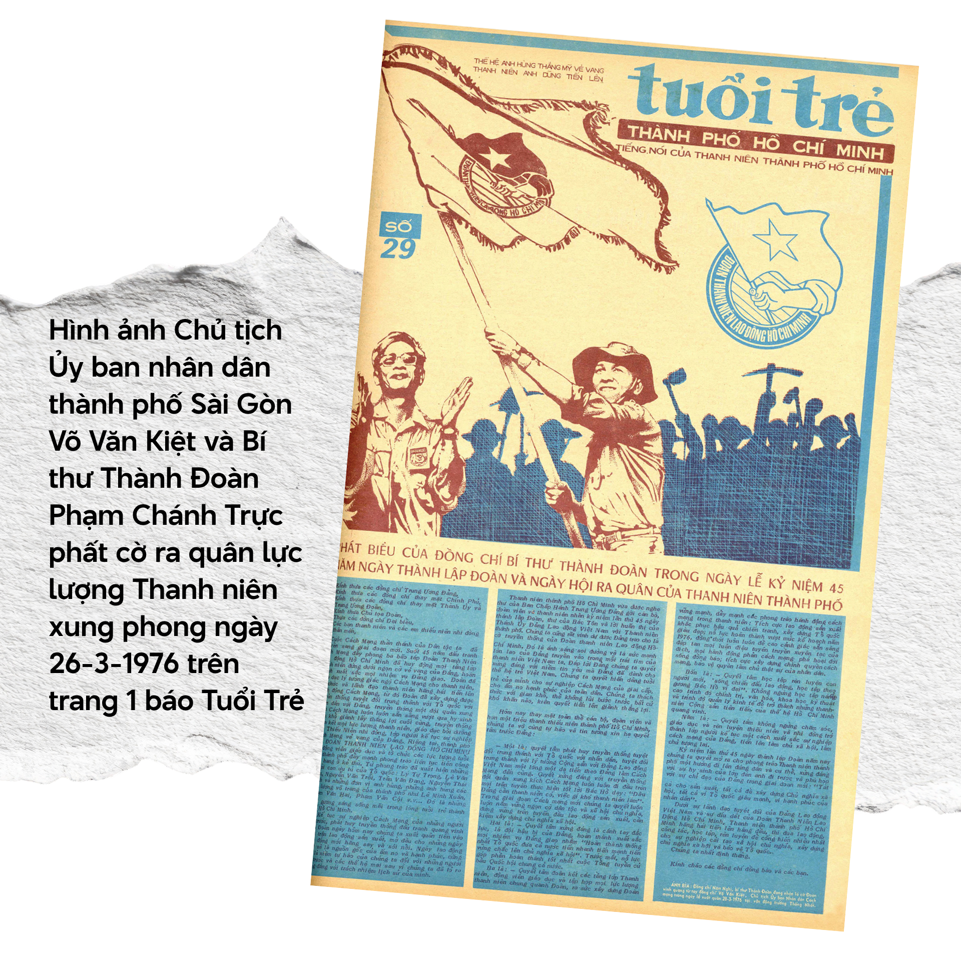 Lực lượng Thanh niên xung phong thành phố ra quân ngày 26-3-1976 với gần 20.000 người trẻ tình nguyện tham gia xây dựng các vùng kinh tế mới và các công trình thủy lợi ngoại thành. Ông Võ Văn Kiệt, Chủ tịch thành phố và anh Phạm Chánh Trực - Bí thư Thành Đoàn - đã phất cờ xuất quân.