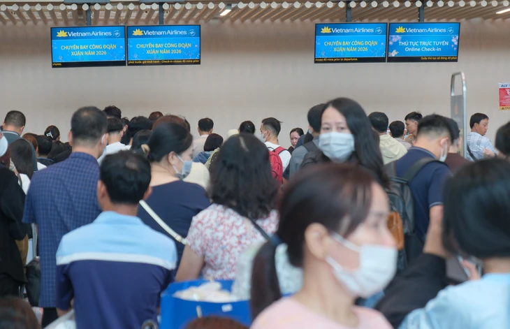 Hàng trăm người lao động làm thủ tục lên các chuyến bay của chương trình Chuyến bay Công đoàn - Xuân 2026 tại nhà ga T3 sân bay Tân Sơn Nhất sáng 12-2 - Ảnh: VŨ THỦY
