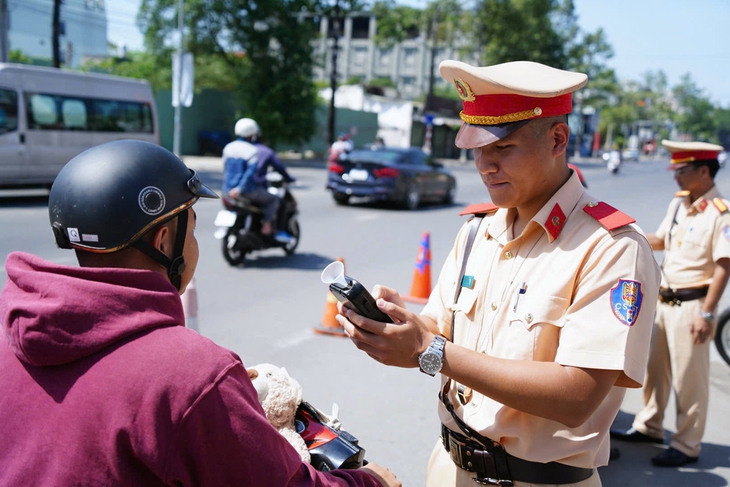 Đội cảnh sát giao thông đường bộ số 1, Phòng Cảnh sát giao thông Công an tỉnh Đồng Nai kiểm tra nồng độ cồn đối với một lái xe trên đường Võ Thị Sáu - Ảnh: A.B.