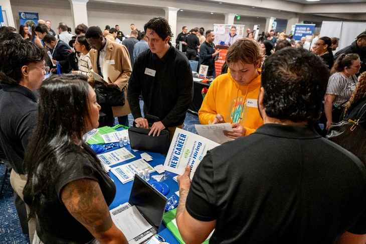 Các ứng viên tìm việc trò chuyện với nhà tuyển dụng tại hội chợ việc làm SacJobs Career ở Sacramento, California, Mỹ, vào ngày 13-11-2025 - Ảnh: bloomberg.com