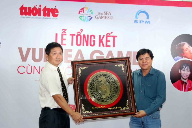 | Tổng biên tập báo Tuổi Trẻ Tăng Hữu Phong (phải) nhận quà lưu niệm từ ông Đào Hữu Hoàng- chủ tịch HĐQT Công ty Cổ phần SPM. Ảnh: N.K |