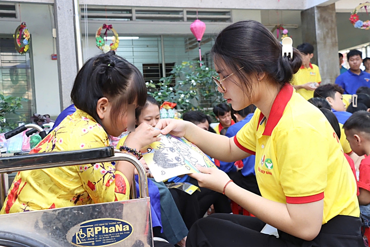 Chiến sĩ Xuân tình nguyện tô tranh cát cùng các bạn nhỏ ở Trung tâm Bảo trợ trẻ tàn tật mồ côi Thị Nghè (phường Gia Định) - Ảnh: LÊ HUY