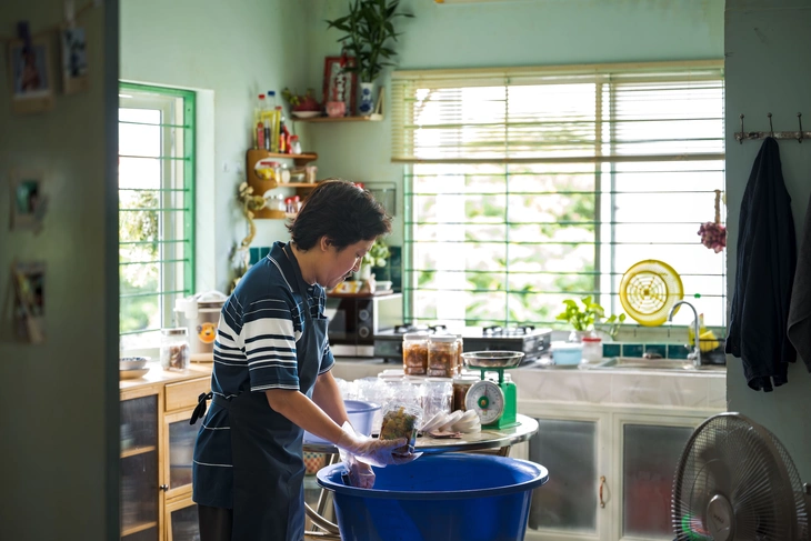 Trường Giang đóng vai ông Thạch làm mắm cà trong phim Nhà ba tôi một phòng - Ảnh: ĐPCC
