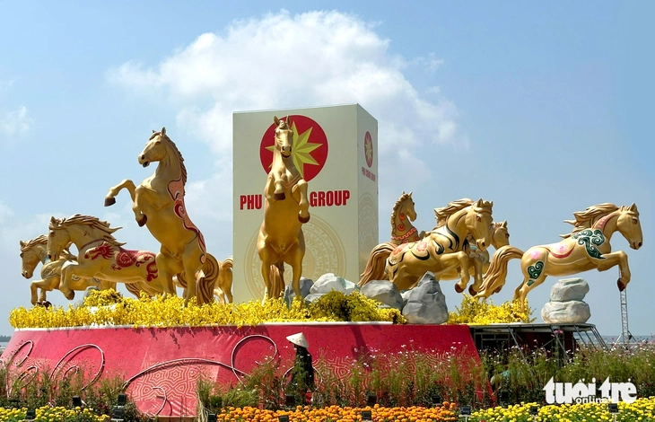 Xung quanh đại cảnh là các cụm hoa xuân, tiểu cảnh nghệ thuật kết hợp hệ thống chiếu sáng, tạo nên không gian rực rỡ nhưng vẫn gần gũi. Hình tượng ngựa vàng - biểu trưng cho sức mạnh, ý chí, lòng kiên trì và tinh thần tiến lên - gửi gắm kỳ vọng về một năm mới hanh thông, bứt phá.