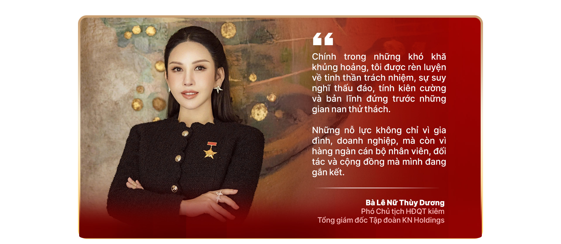 "Danh hiệu vinh dự này không chỉ là niềm tự hào mà còn là trách nhiệm lớn lao, nhắc nhở tôi rằng mỗi bước phát triển của Tập đoàn KN Holdings đều phải gắn với tinh thần phụng sự, đúng với truyền thống gia đình mà ba mẹ tôi - đều là AHLĐ - đã làm đến nay", bà Dương nói.