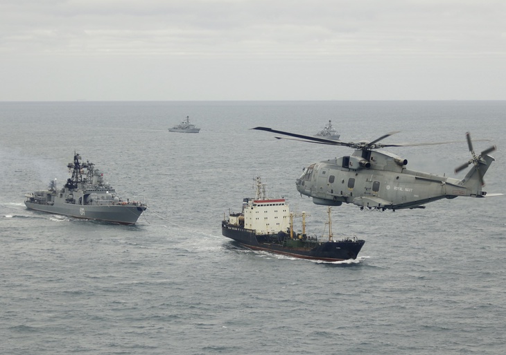 Tàu chiến và máy bay của Anh theo dõi tàu chiến Nga trong chiến dịch phối hợp với các đồng minh của London - Ảnh: Bộ Quốc phòng Anh