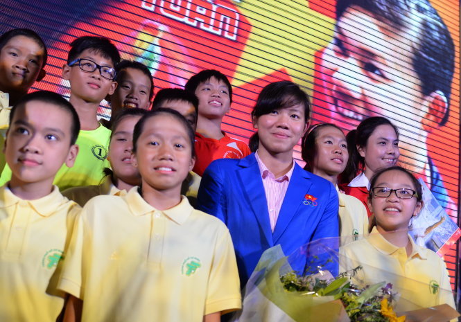 Háo hức được gặp Ánh Viên nhiều nhất có lẽ là những VĐV “nhí” của TP.HCM, ngồi rất gần sân khấu và trên tay ôm những bó hoa đợi chờ thần tượng. Các em đều ở tuổi 11 - 13, đã thi đấu ở nhiều giải nhi đồng, giải toàn năng, giải vui hè…