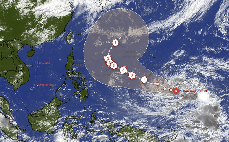 Lúc 7h sáng nay, tâm áp thấp nhiệt đới đang cách Philippines gần 3.000km về phía đông, cường độ hiện tại mạnh cấp 7, giật cấp 9.