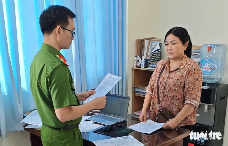 Cơ quan công an đang tống đạt quyết định khởi tố đối với bà Triều - Ảnh: Công an Vĩnh Long