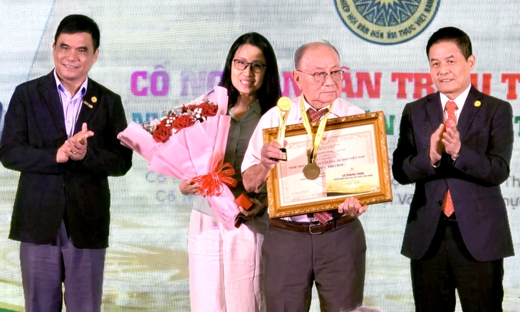 Tổng giám đốc Đài Phát thanh - Truyền hình TP.HCM Cao Anh Minh và ông Nguyễn Quốc Kỳ - Chủ tịch Hiệp hội Văn hóa Ẩm thực Việt Nam - trao tặng danh hiệu cho chồng và con gái cố nghệ nhân Triệu Thị Chơi - Ảnh: HOÀNG LÊ