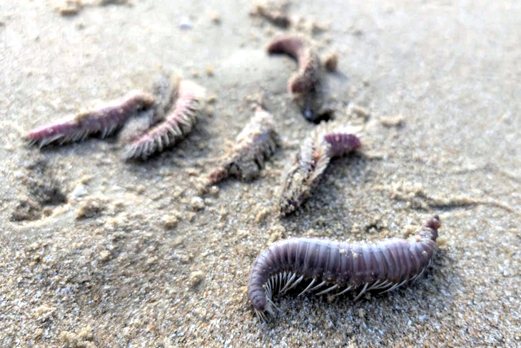 Sâu biển có hình dạng như sâu róm phủ lông, dài 10-15cm xuất hiện dàn trải toàn bộ bãi biển, lơ lửng trong nước hoăc dạt vào bãi cát. Nhiều con sâu biển đã chết, nằm ngửa bụng.
