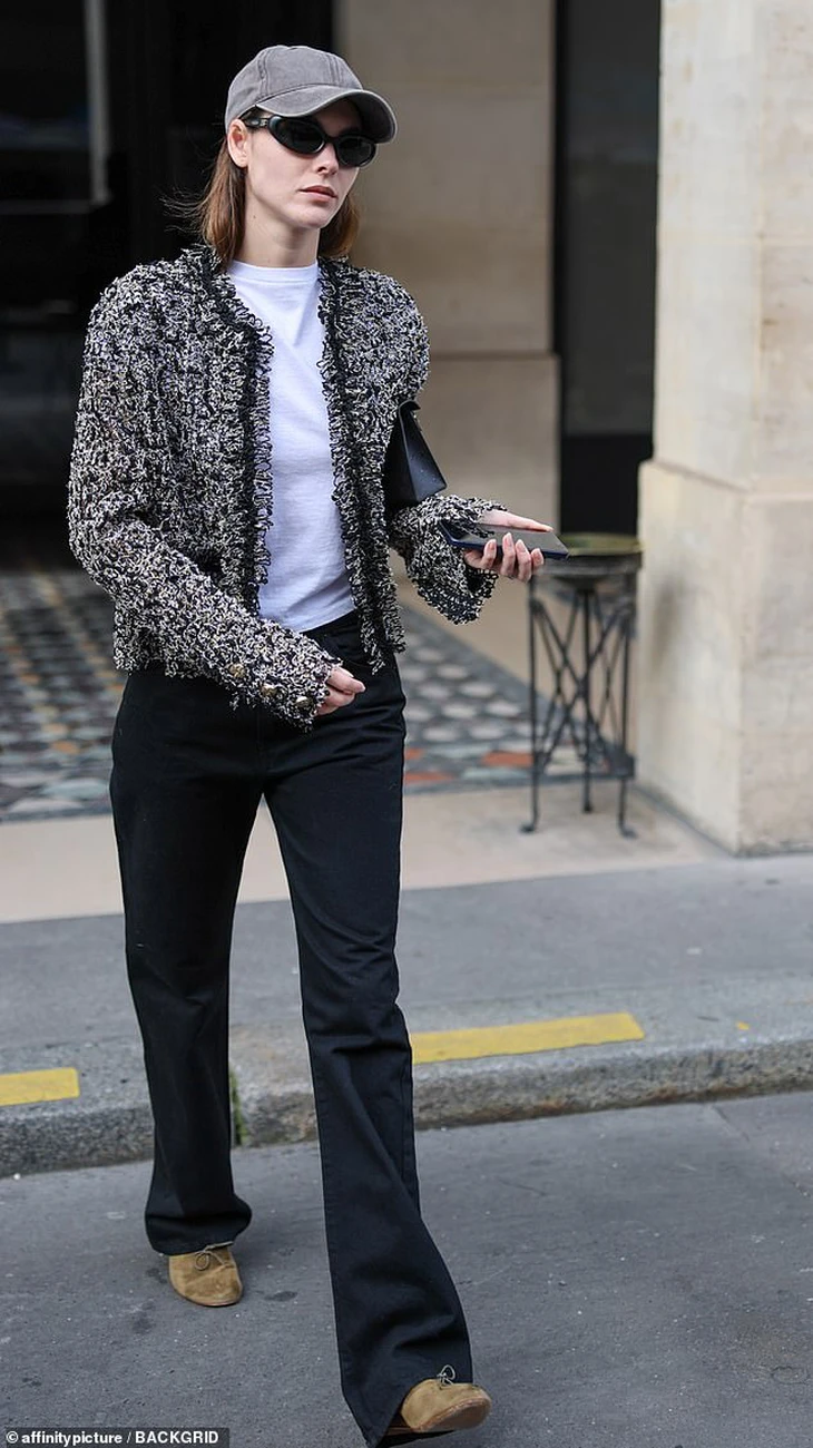 Người mẫu Ý 27 tuổi diện chiếc áo khoác tweed đen thanh lịch, phối cùng áo phông trắng đơn giản bên trong. Cô kết hợp trang phục với quần jeans đen dáng ôm và đôi giày bệt da lộn màu be. Mỹ nhân hoàn thiện tổng thể bằng kính râm mắt mèo màu đen và mũ lưỡi trai xám bạc màu.