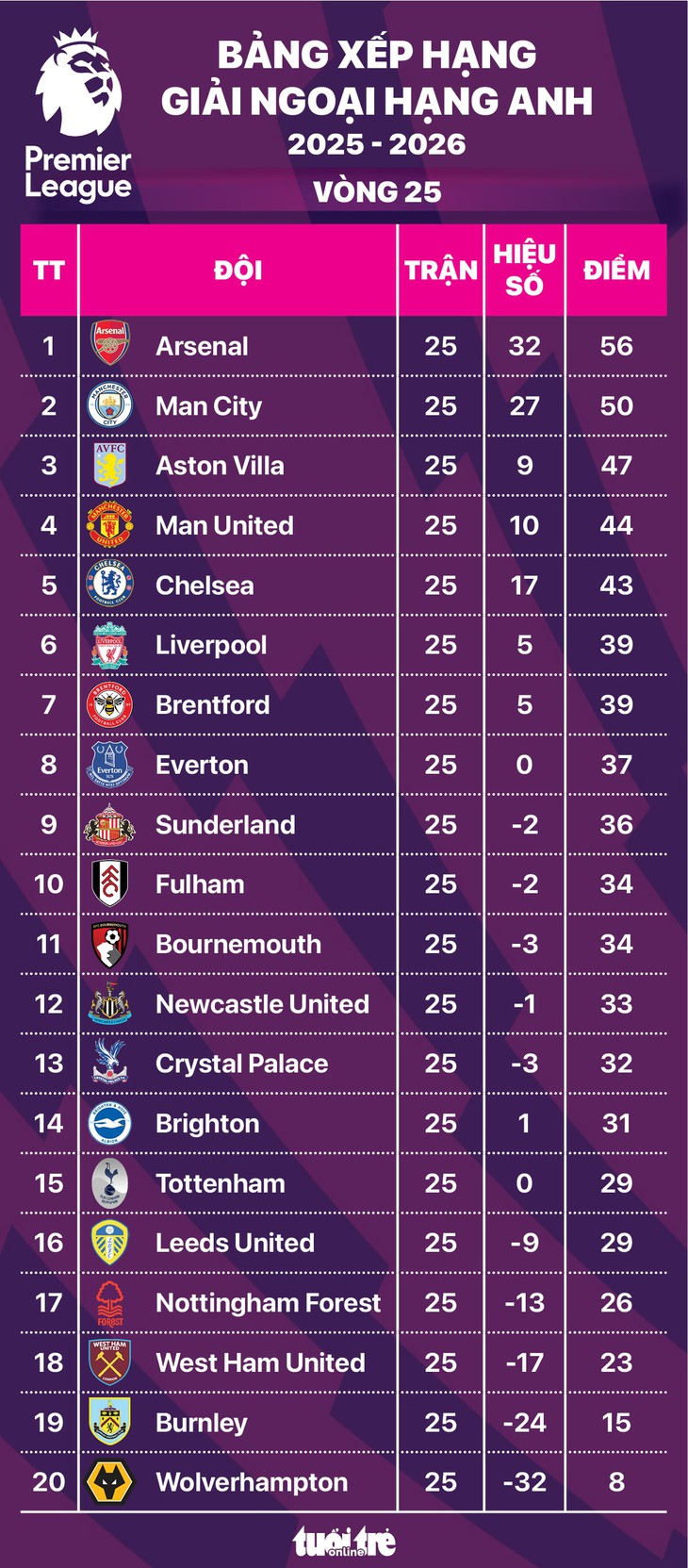 Bảng xếp hạng Ngoại hạng Anh vòng 25: Man City bám đuổi Arsenal, Man United top 4 - Đồ họa: AN BÌNH