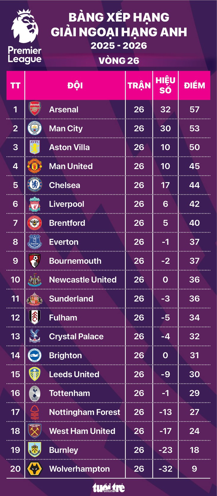 Bảng xếp hạng Ngoại hạng Anh vòng 26: Man United hạng 4 - Đồ họa: AN BÌNH