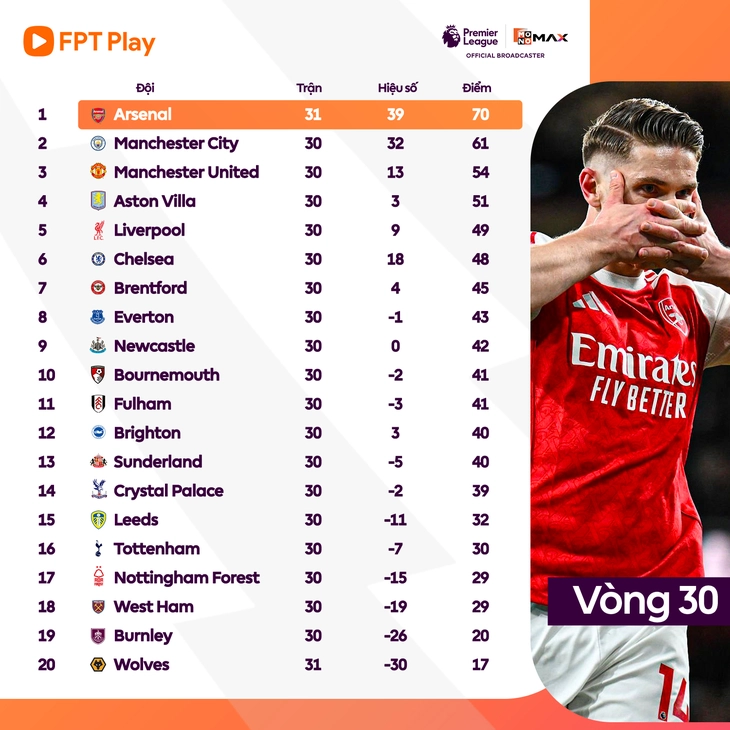 Bảng xếp hạng Premier League vòng 30: Arsenal bỏ xa Man City - Ảnh: FPT PLAY