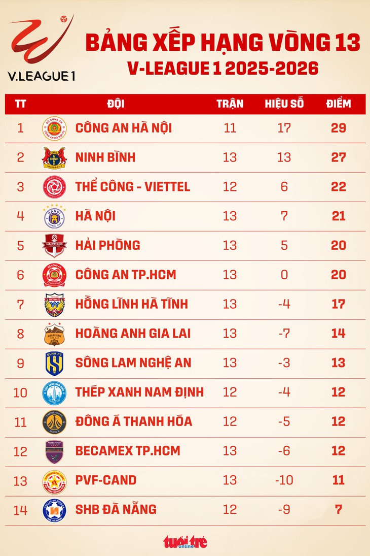 Bảng xếp hạng V-League vòng 13: CLB Công An Hà Nội dẫn đầu, SHB chót bảng - Đồ họa: AN BÌNH