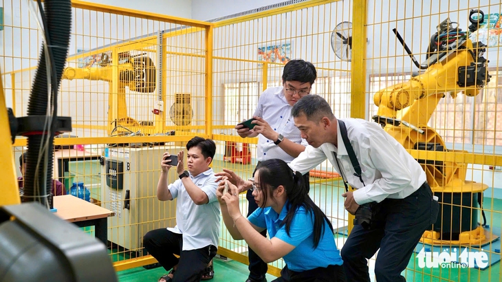 Nhà báo Trần Tiến Dũng hướng dẫn cho các học viên tác nghiệp tại Trung tâm robot công nghiệp Lilama 2 trong chuyên đề 1 - Ảnh: THỤC NGUYÊN