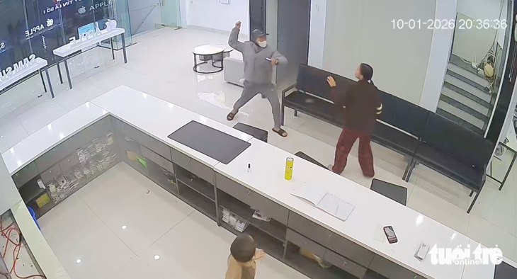 Kẻ cướp dùng vật nhọn đe dọa nữ chủ cửa hàng khi cướp hai chiếc iPhone 14 Promax - Ảnh: TÂM PHẠM