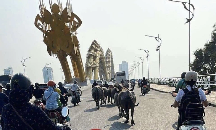 Đàn trâu xuất hiện trên cầu Rồng - Ảnh mạng xã hội