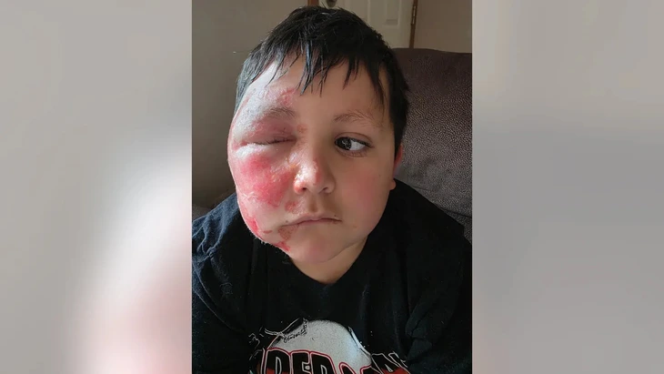 Khi chạy vào kiểm tra, cô Grubb phát hiện toàn bộ bên phải khuôn mặt con trai bị phủ kín bởi một lớp gel đặc, vùng da bên dưới đỏ rực.