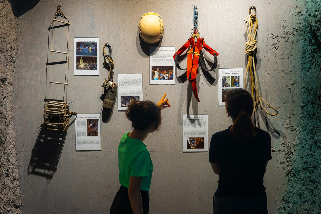 Khu trưng bày còn giới thiệu các thiết bị thám hiểm chuyên dụng từng được sử dụng trong điều kiện khắc nghiệt dưới lòng đất. Từ dây leo, đèn chuyên dụng đến các công cụ đo đạc, tất cả tái hiện chân thực hành trình khám phá những hang động nổi tiếng như hang Én, hang Va và đặc biệt là Sơn Đoòng - hang động lớn nhất thế giới.