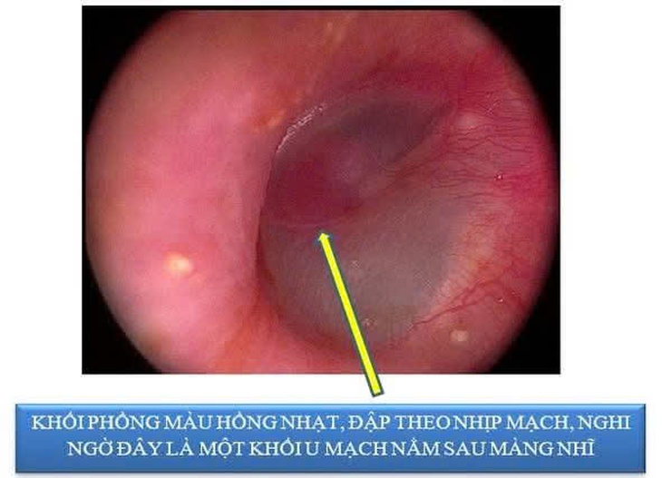 Tại Bệnh viện Tai Mũi Họng TP Cần Thơ, các bác sĩ thăm khám và nội soi, bất ngờ phát hiện phía sau màng nhĩ trái có một khối phồng màu hồng nhạt, đập theo nhịp mạch.