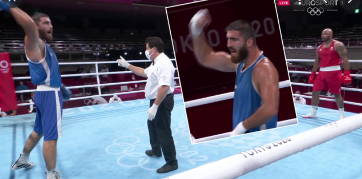 Võ sĩ người Pháp Mourad Aliev đã "nổi điên" sau khi bị truất quyền thi đấu với lý do "húc đầu" vào đối thủ - Ảnh: Eurosport