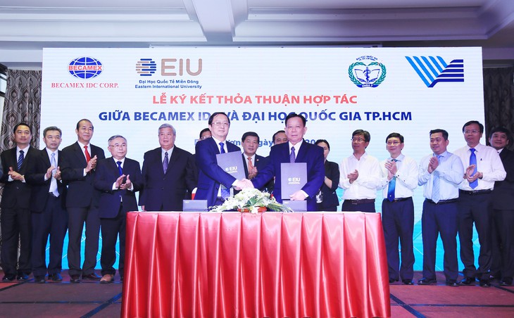 Đại diện Đại học Quốc gia TP.HCM và Tổng công ty Becamex IDC ký ghi nhớ hợp tác giai đoạn 2018-2023 - Ảnh: BÁ SƠN