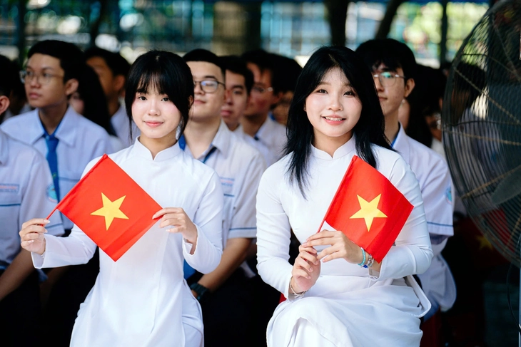 Nữ sinh Trường THPT Trần Phú (phường Phú Thọ Hòa, TP.HCM) trong ngày khai giảng năm học mới 2025-2026 - Ảnh: THANH HIỆP