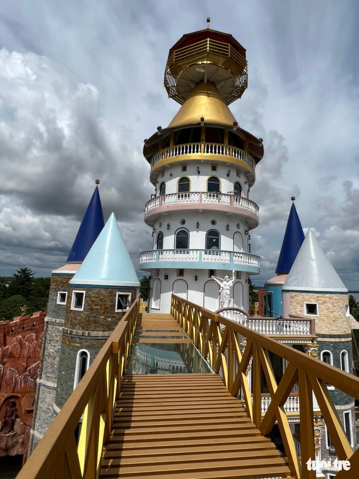Phía sau khu vực bán nước uống là một tổ hợp gồm tòa lâu đài cao khoảng 30m, khu tháp có tượng Phật màu vàng, mô phỏng công trình Vạn lý trường thành và tượng Phật đưa 2 tay nâng chiếc cầu vàng…