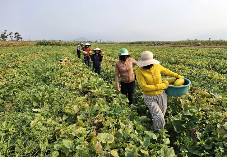 Phụ nữ xã Cổ Đạm chung tay thu hoạch dưa giúp gia đình chị Mong - Ảnh: H.A.
