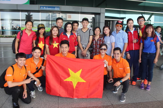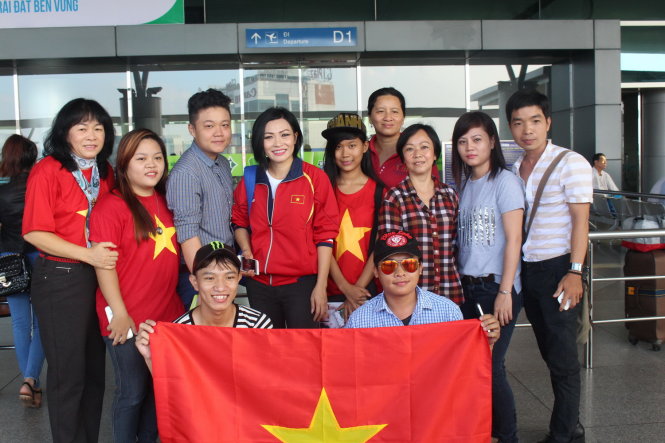 | Ca sỹ Phương Thanh (thứ tư từ trái sang, hàng đứng) chụp ảnh lưu niệm tại sân bay. Ảnh: H.D |