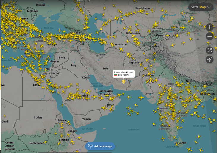 Dữ liệu trang theo dõi chuyến bay thời gian thực FlightRadar24 cho thấy không phận Iran, Iraq, Syria... vắng bóng máy bay thương mại - Ảnh: TUẤN PHÙNG chụp lại