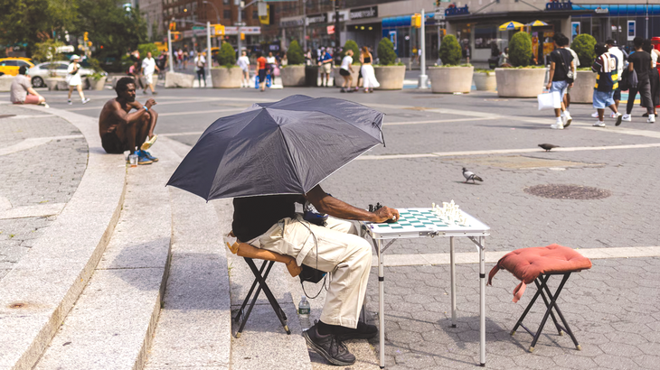 Một người đàn ông cầm ô khi chơi cờ trong đợt nắng nóng vào tháng 6-2024 ở Mỹ - Ảnh: Reuters