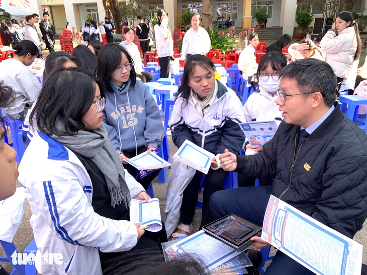ThS Cù Xuân Tiến - Trưởng phòng tuyển sinh và công tác sinh viên Trường đại học Kinh tế - Luật (Đại học Quốc gia TP.HCM) giải đáp thắc mắc của học sinh về xét tuyển học bạ trong chương trình Tư vấn tuyển sinh - hướng nghiệp 2026 do báo Tuổi Trẻ tổ chức - Ảnh: TRẦN HUỲNH